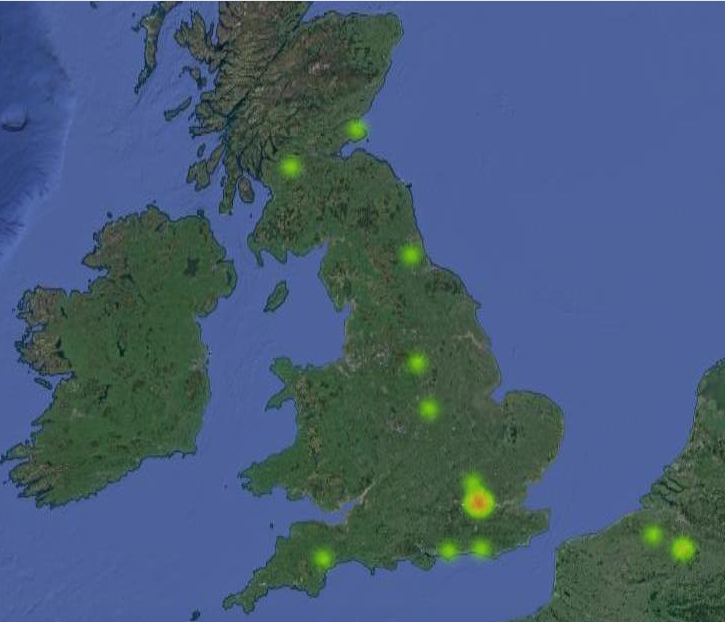 Heatmap of British Contributors to The Programming Historian since launch. Map produced using Google Fusion Tables.